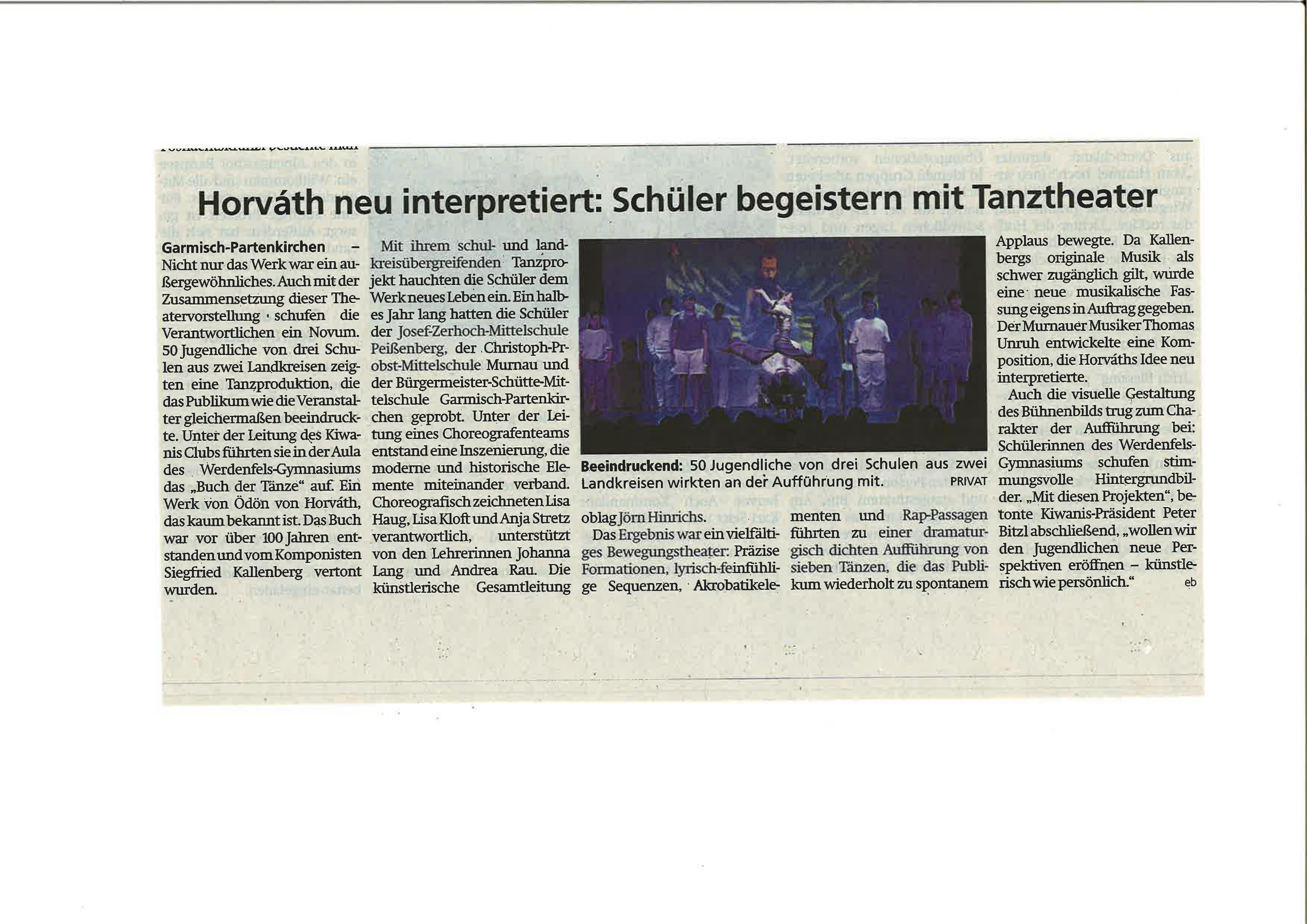 Garmisch-Partenkirchen - Mit sichtbarer Begeisterung endete in der Werdenfels-Aula die außergewöhnliche und unter Leitung des Kiwanis Clubs entstandene Tanzproduktion „Das Buch der Tänze“. Nicht nur das Werk war außergewöhnlich auch die Zusammensetzung der Tanzkompanie war ein Novum. 50 Jugendlichen von drei Schulen aus zwei Landkreisen schufen ein Bewegungstheater, das Publikum wie Veranstalter gleichermaßen beeindruckte.