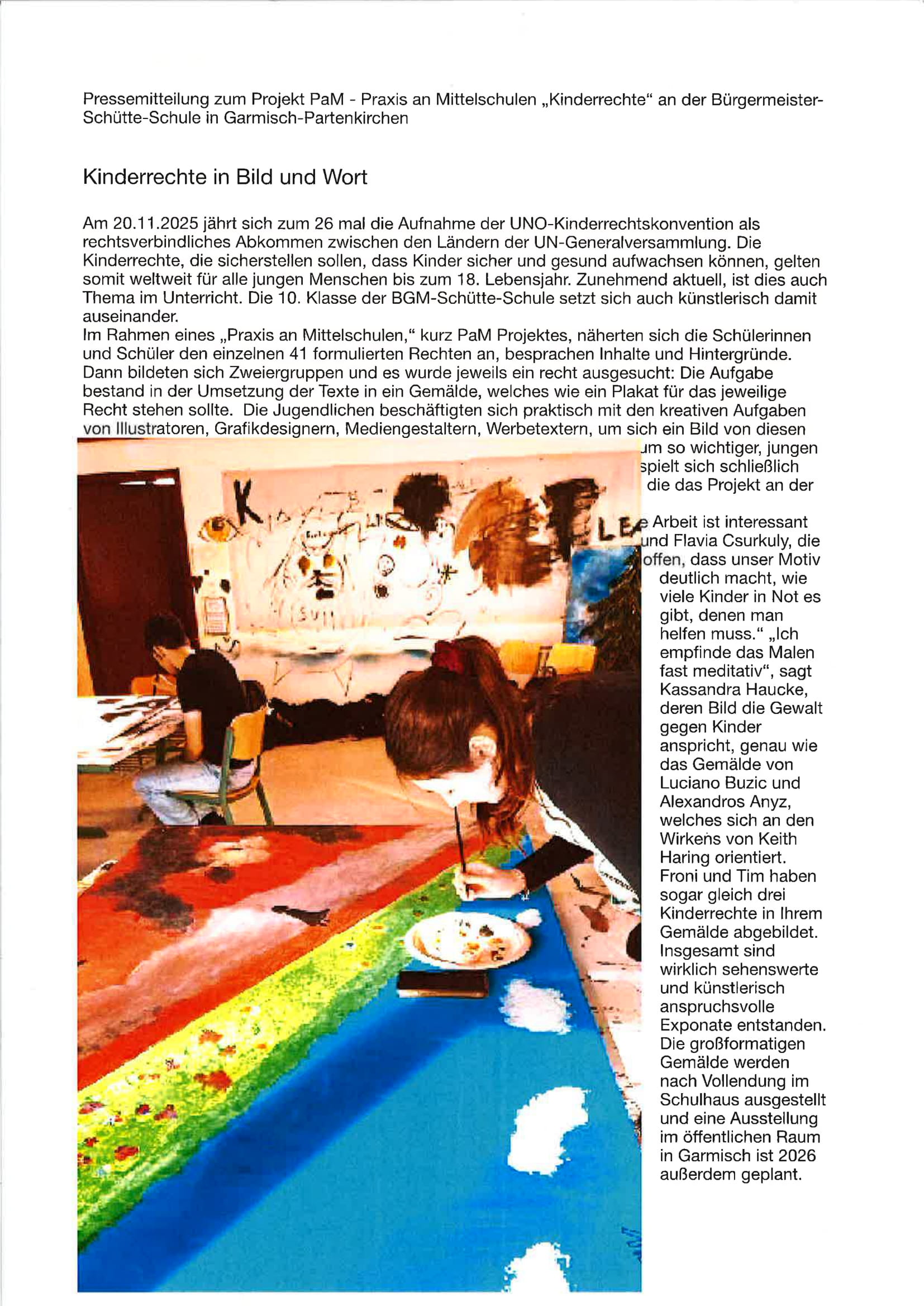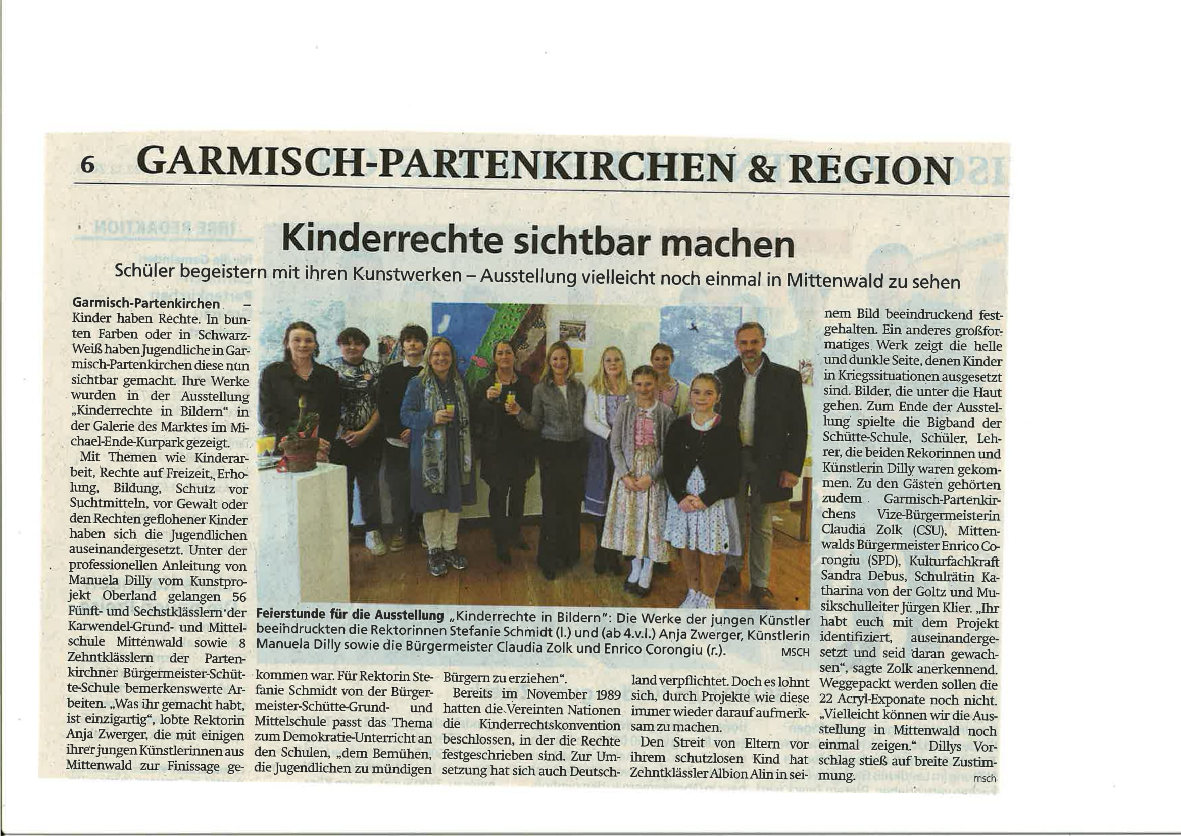 In einem großen Kunstprojekt setzten sich Schülerinnen und Schüler der Bürgermeister-Schütte-Schule gemeinsam mit Jugendlichen der Karwendel- und Mittelschule Mittenwald intensiv mit Kinderrechten auseinander. Unter Anleitung der Künstlerin Manuela Dilly entstanden 22 großformatige Acrylbilder zu Themen wie Recht auf Freizeit, Bildung, Schutz vor Gewalt, Kinderarbeit und die Situation geflüchteter Kinder.[6]