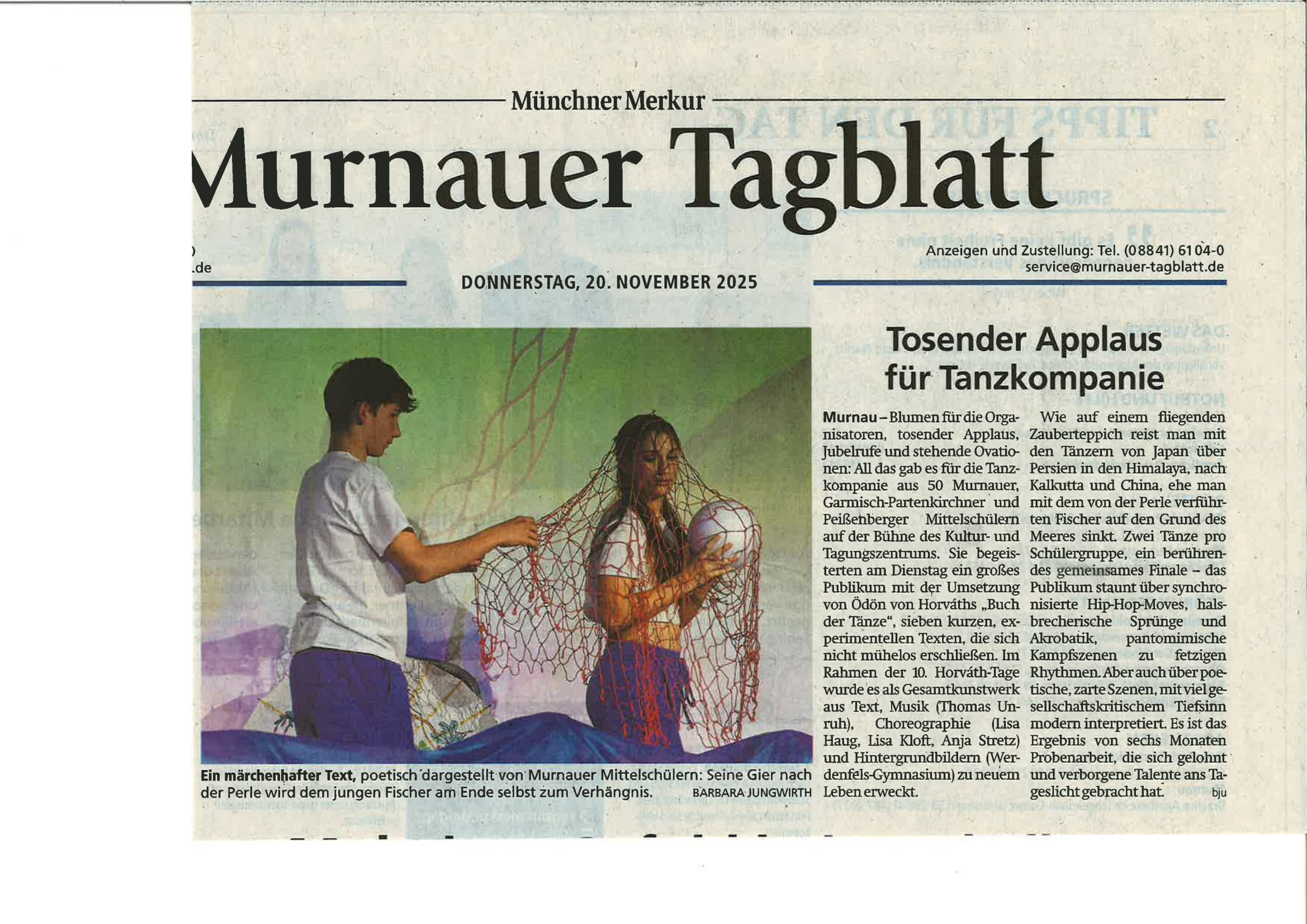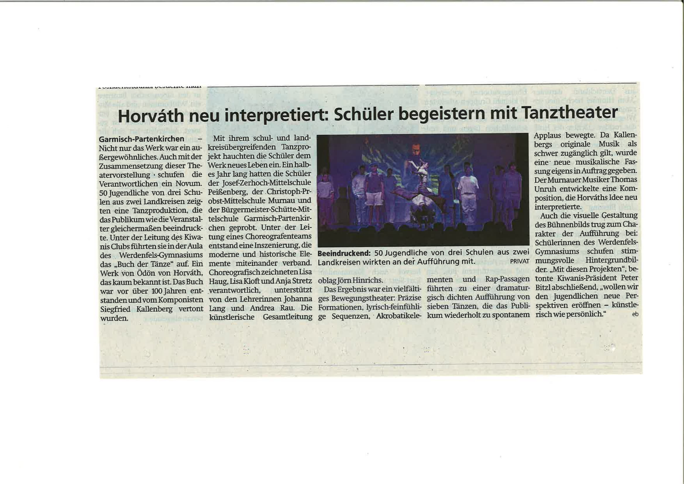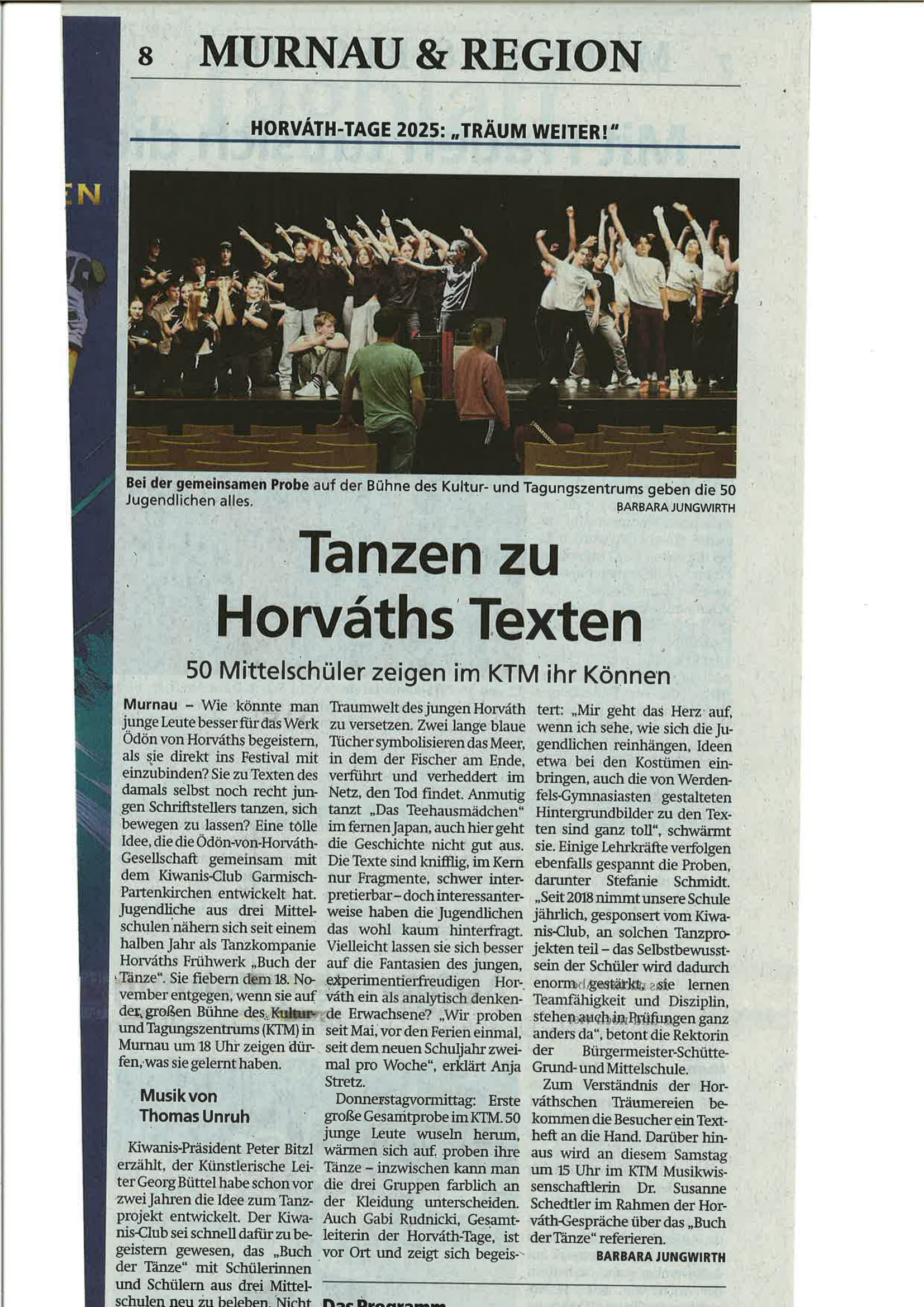 Im Rahmen der Horváth-Tage beteiligten sich Schülerinnen und Schüler der Bürgermeister-Schütte-Schule an einem Tanzprojekt zum „Buch der Tnze“ von Ödön von Horváth. Gemeinsam mit Jugendlichen aus Murnau und Peißenberg probten sie über Monate als Tanzkompanie an Choreographien zu experimentellen Textfragmenten.[4][7]