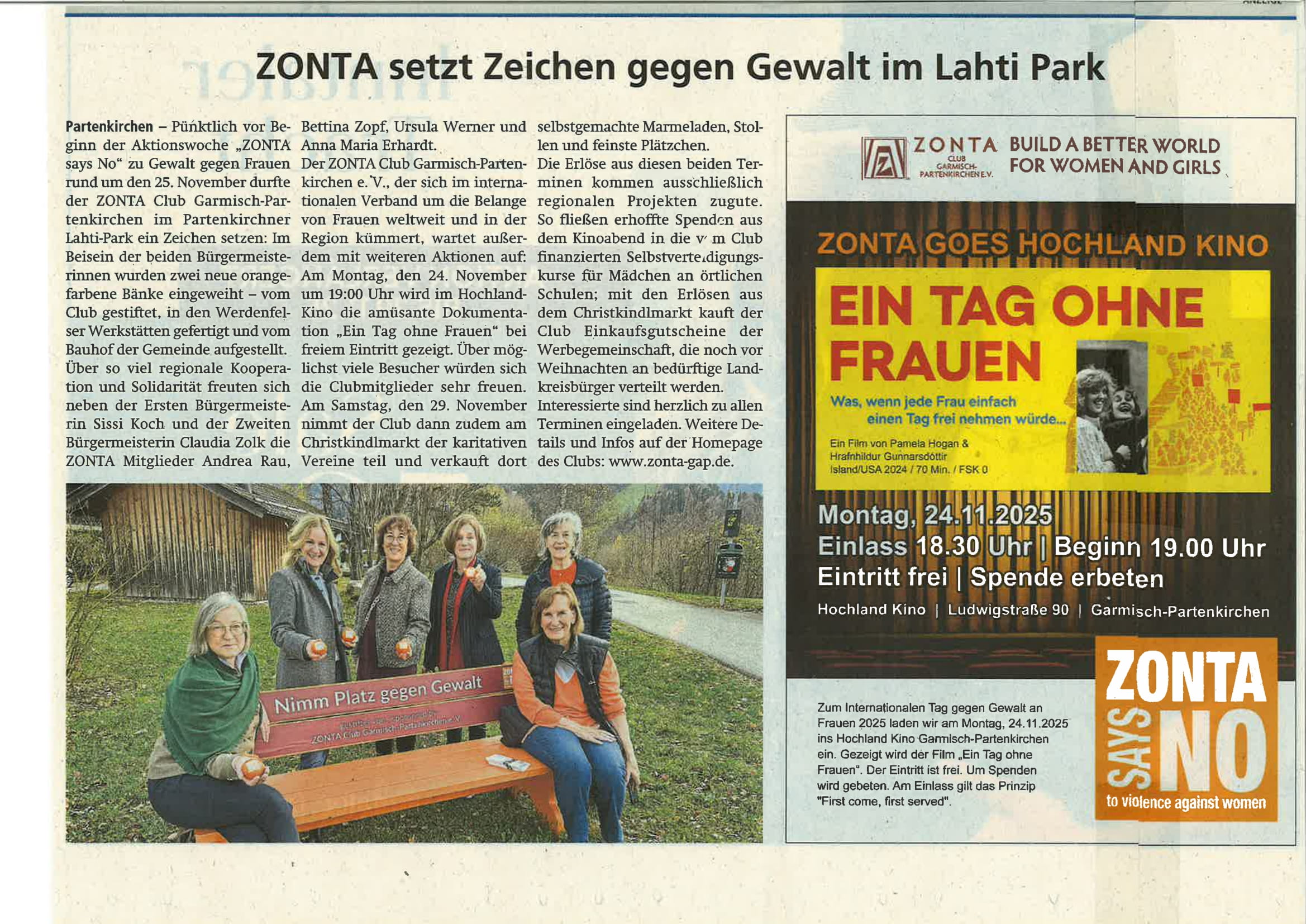 Der ZONTA Club Garmisch-Partenkirchen weihte im Lahti-Park zwei orangefarbene Bänke als sichtbares Zeichen gegen Gewalt an Frauen ein. Die Bänke wurden in den Werdenfelser Werkstätten gefertigt und in Anwesenheit der Bürgermeisterinnen sowie der ZONTA-Mitglieder feierlich übergeben.[3]