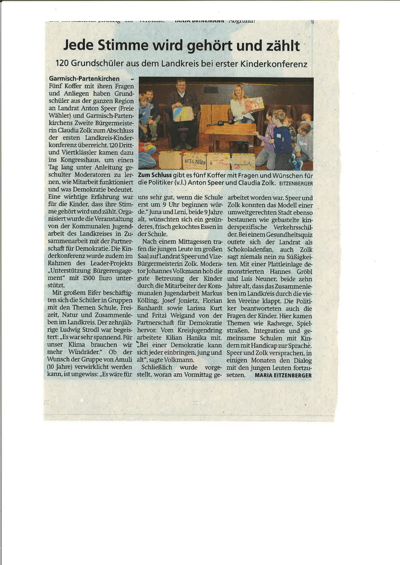 120 Dritt- und Viertklässler aus dem Landkreis nahmen an der ersten Kinderkonferenz im Kongresshaus Garmisch-Partenkirchen teil. Unter Anleitung geschulter Moderatorinnen und Moderatoren arbeiteten sie in Gruppen zu den Themen Schule, Freizeit, Natur und Zusammenleben und lernten, wie Beteiligung und Demokratie funktionieren.[5]