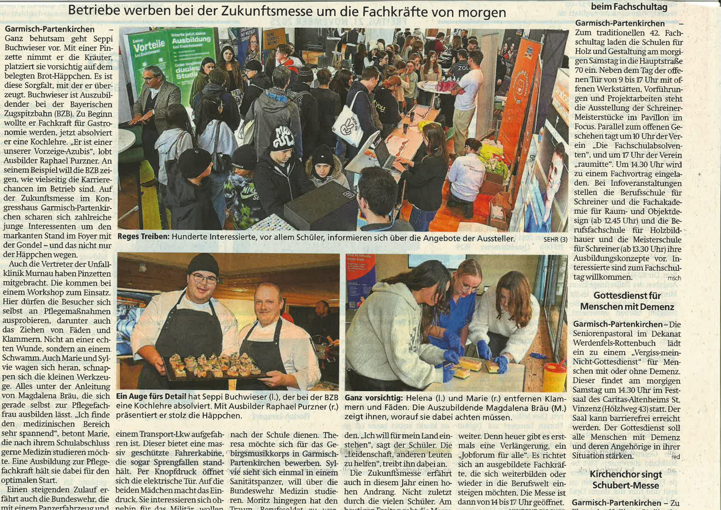 Zusätzlich präsentierten sich Betriebe und Institutionen bei der Zukunftsmesse im Kongresshaus Garmisch-Partenkirchen, wo sich Jugendliche über Ausbildungswege etwa bei der Bayerischen Zugspitzbahn, der Unfallklinik Murnau oder der Bundeswehr informierten. Workshops, praktische Übungen – vom Garnieren von Häppchen bis zum Fädenziehen an Übungsmaterial – machten Berufe erlebbar und stärkten die Orientierung nach dem Schulabschluss.[1]