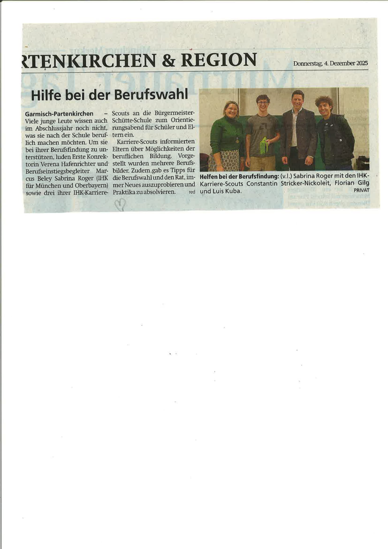 Bei einem Orientierungsabend informierten Karriere-Scouts der IHK für München und Oberbayern gemeinsam mit der Schulleitung über berufliche Bildung und verschiedene Berufsbilder. Schülerinnen, Schüler und Eltern erhielten konkrete Tipps zur Berufswahl und zur Bedeutung von Praktika, um eigene Stärken und Interessen zu entdecken.[12]