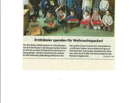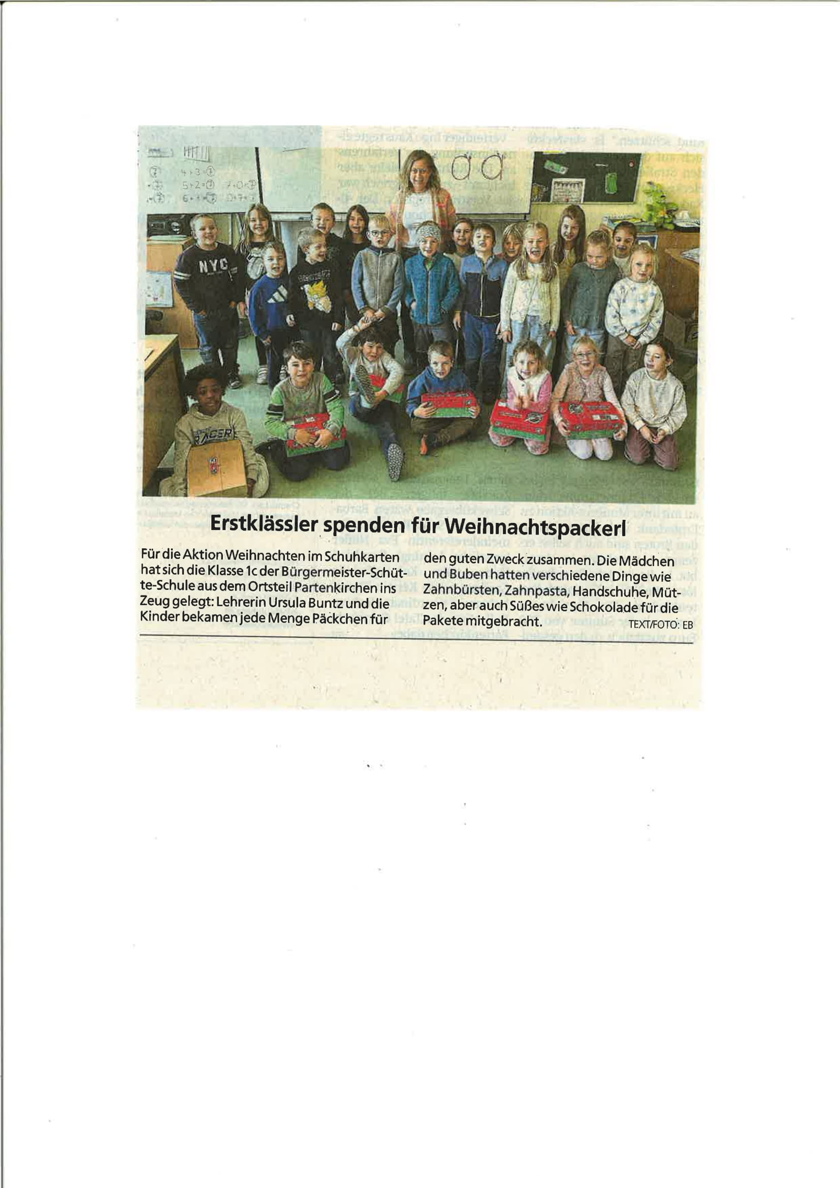 Die Klasse 1c im Ortsteil Partenkirchen sammelte für die Aktion „Weihnachten im Schuhkarton“ zahlreiche Päckchen. Gemeinsam mit Lehrerin Ursula Buntz packten die Kinder Zahnbürsten, Zahnpasta, Handschuhe, Mützen und Süßigkeiten wie Schokolade für Gleichaltrige in Not.[11]